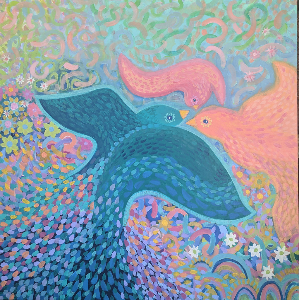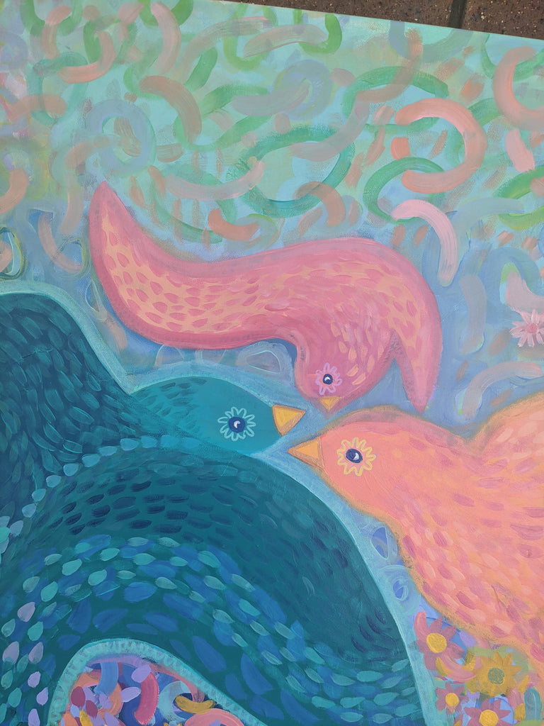 Flock Together is 81cm x 81cm on artist quality stretched 37mm thick canvas ready to hang in your home or office.