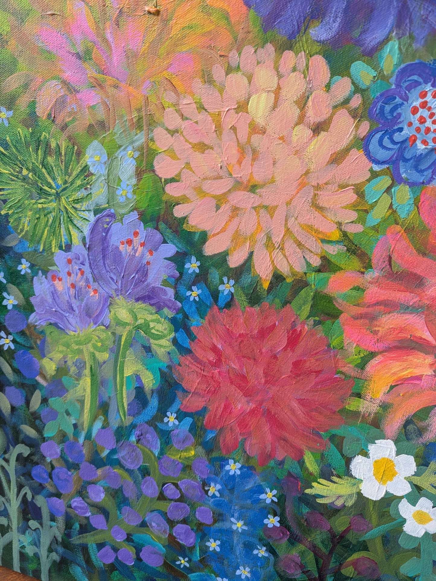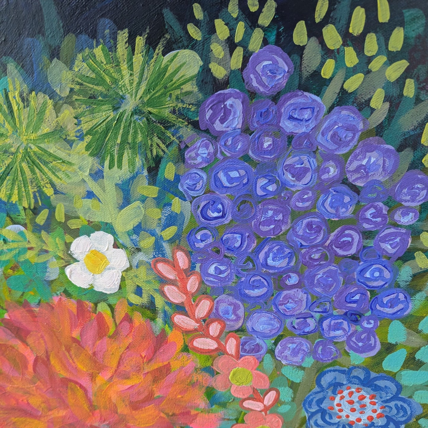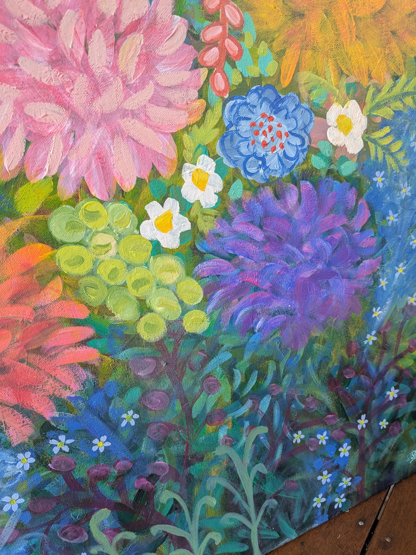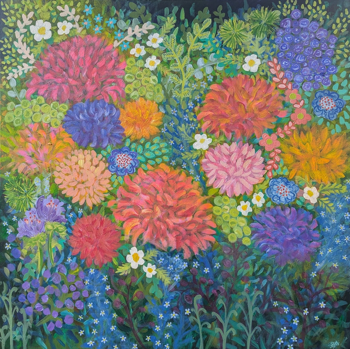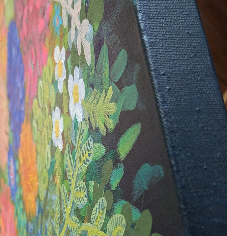 She Blooms Again is 102cm (40 inches) square on double thick artist canvas and ready to hang on your wall.
