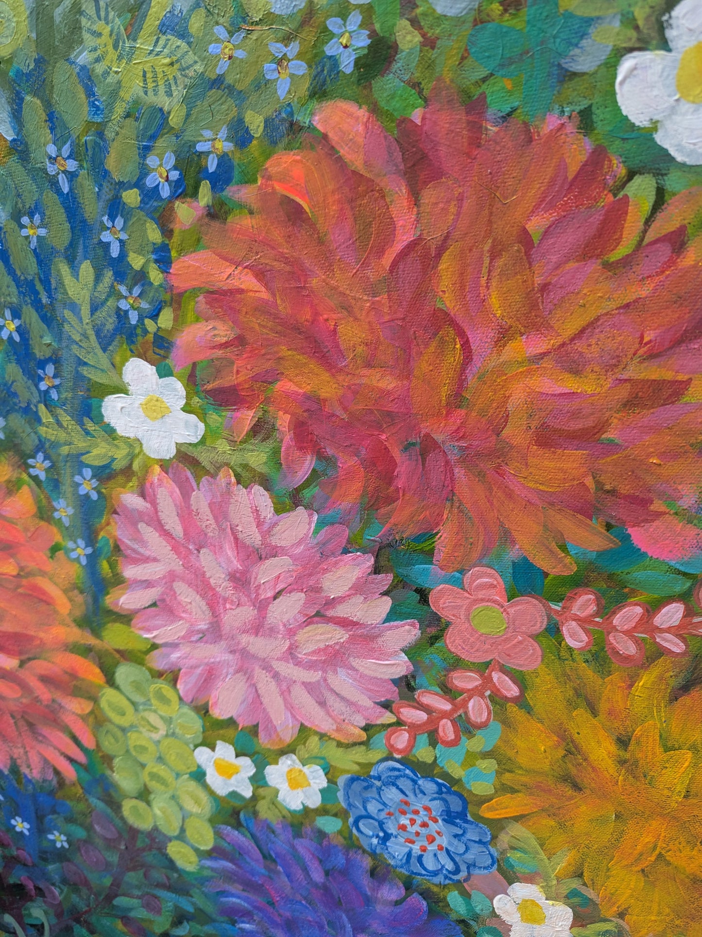 "She Blooms Again" is a stunning, vibrant floral artwork that radiates energy and life through its bold use of acrylic paint. This large, square painting features a dynamic display of colorful blooms, each petal and leaf infused with a sense of movement and joy. Expressive brushstrokes capture the essence of nature in full bloom, as if the flowers themselves are celebrating a powerful rebirth.