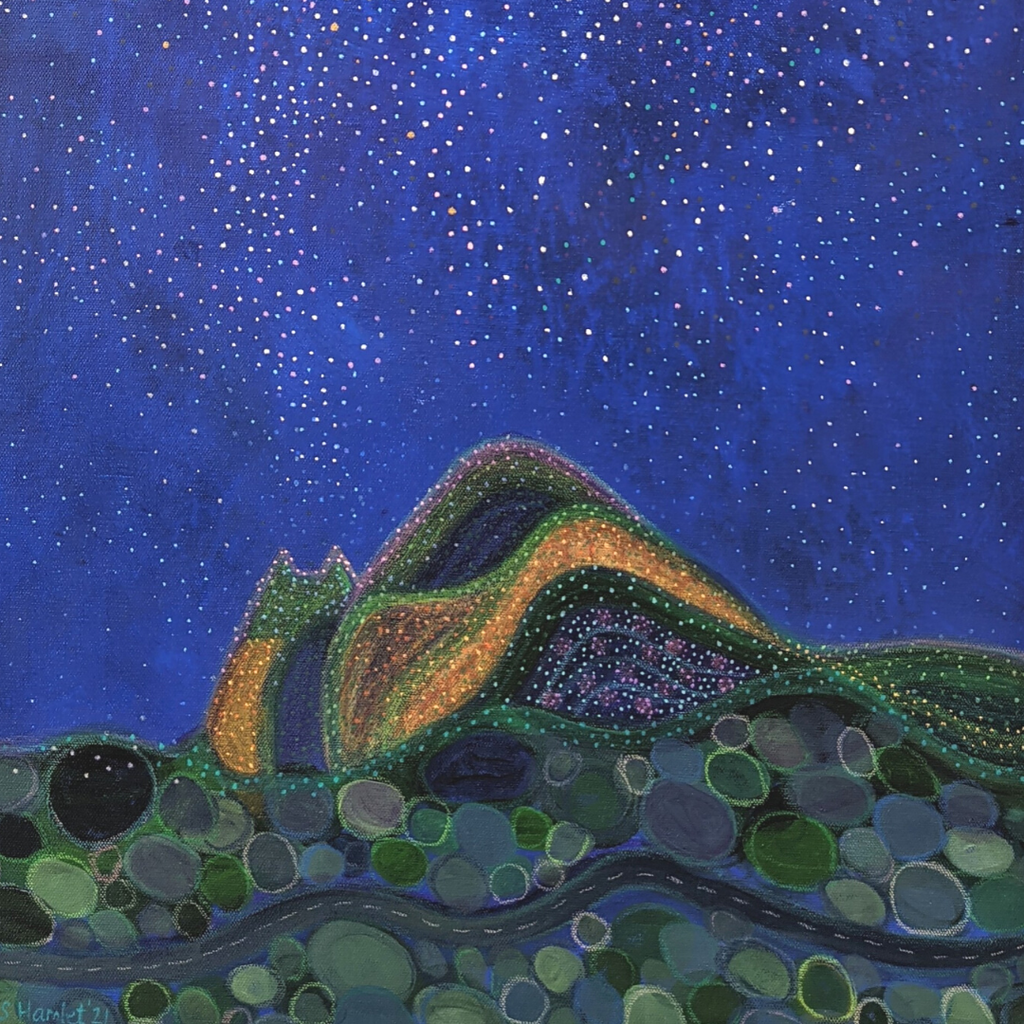 This mixed media painting is inspired by a curiously shaped mountain on the Warwick/Brisbane drive. We all seem to have different names for it - mouse mountain, cat mountain, rabbit mountain, possum mountain and there are many more. Its real name is Mount Greville. We often do that journey at night and I think of it as an animal tucked in for the evening, slumbering contentedly under the stars.