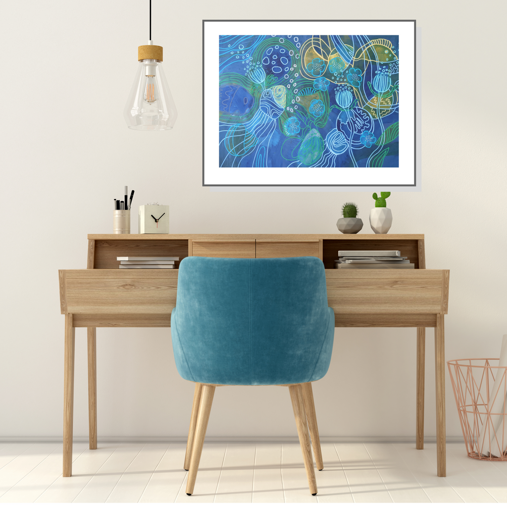 This work is acrylic paint including posture pens on 597 x 420mm heavy art paper. It is unframed and would suit can A2 (to edge) or A1 (with mat) frame, sizes which are available off the shelf. Or you could elevate it with a custom made frame.