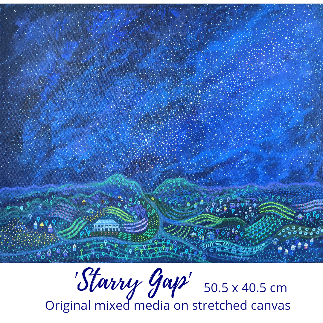 Starlight is simply awe-inspiring in the country. In my latest starscape, the clear bright night sky spans Cunningham's Gap and Main Range National Park. The naive impressionist foreground references rural landscapes across Glengallan Homestead, Maryvale, Allora, North Beach and Freestone and the edges of Warwick.