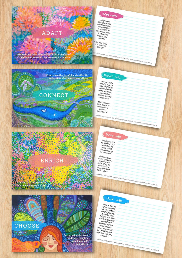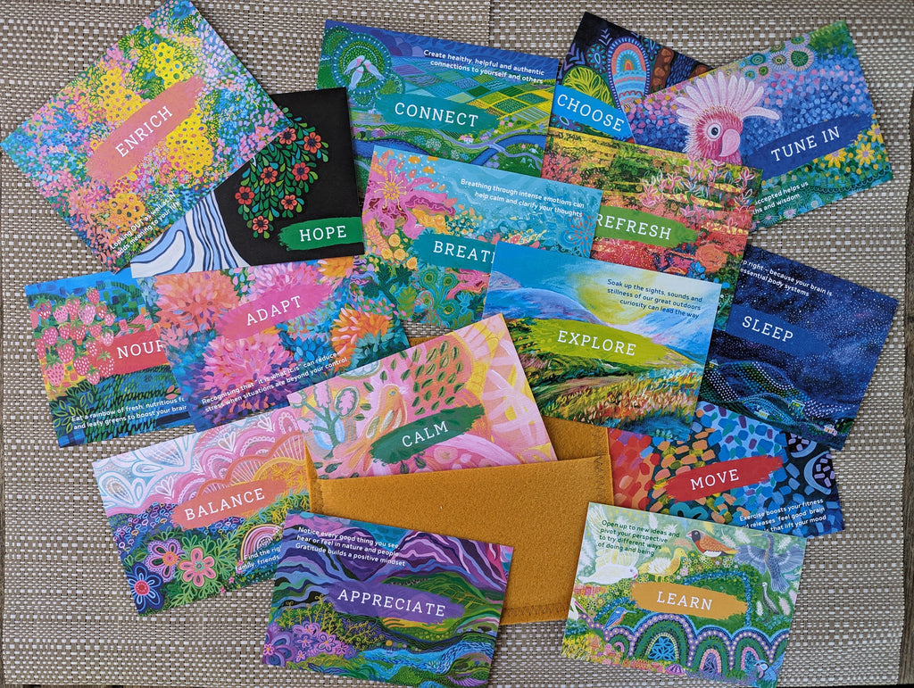 This self-care and wellbeing pack of 16 cards combines uplifting artworks with proven recovery and mindset strategies — giving people practical, creative tools to support their mental health.