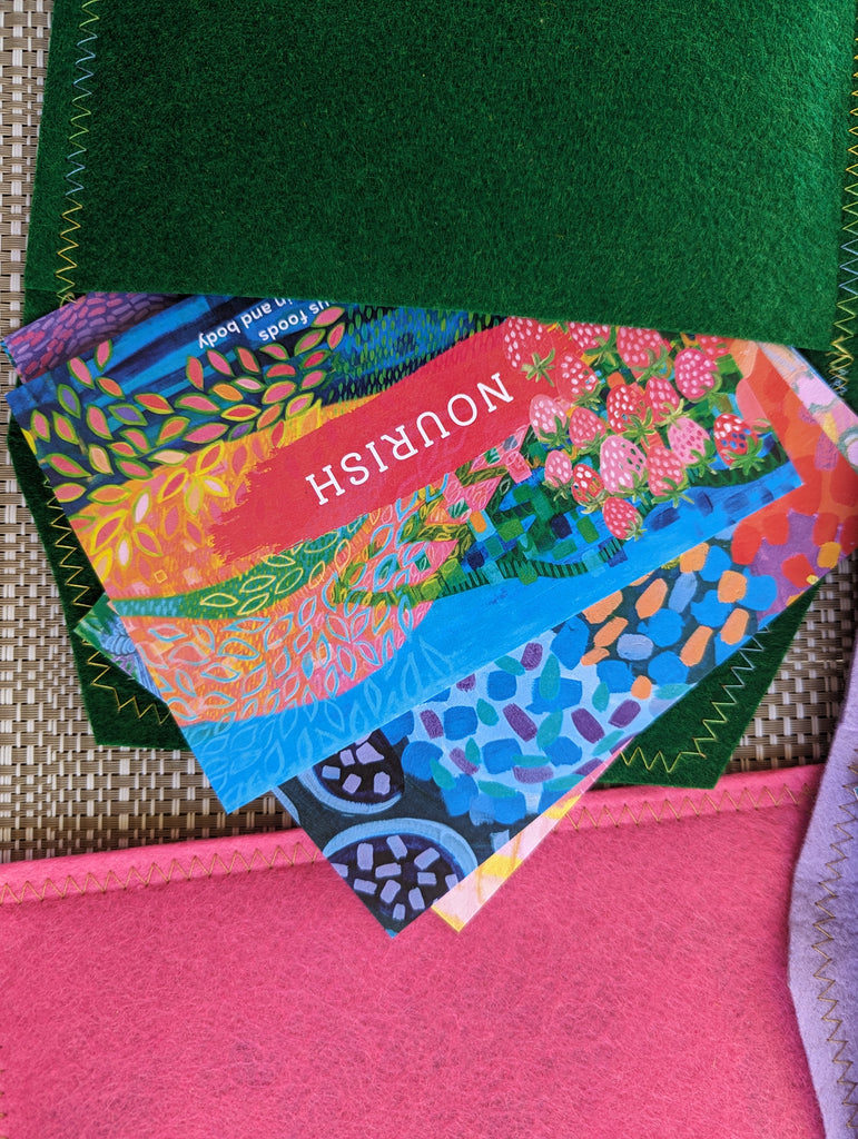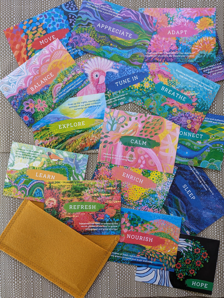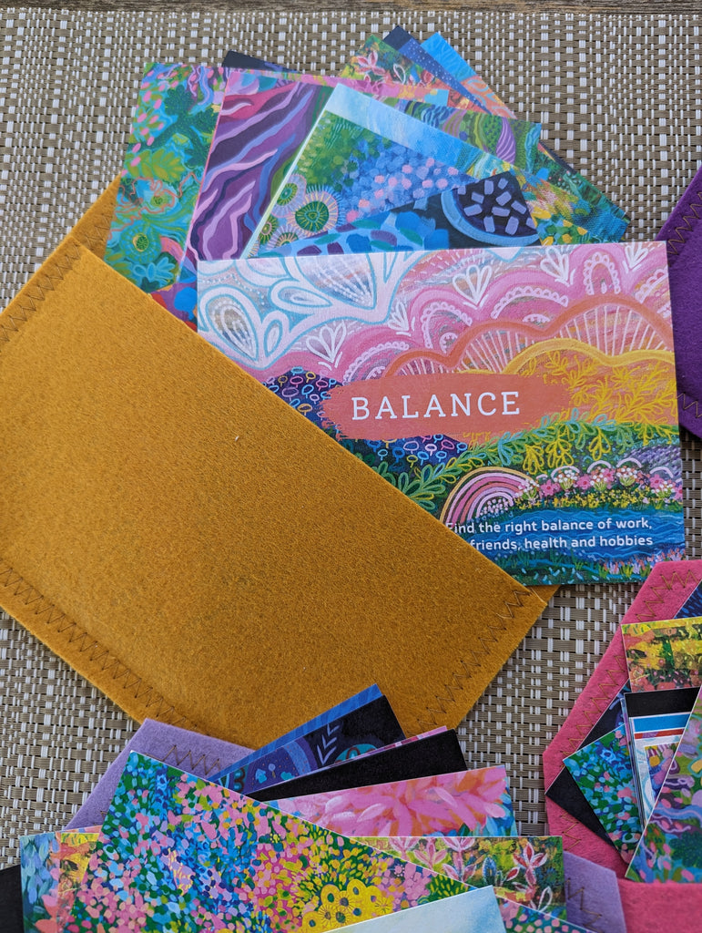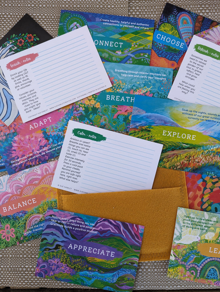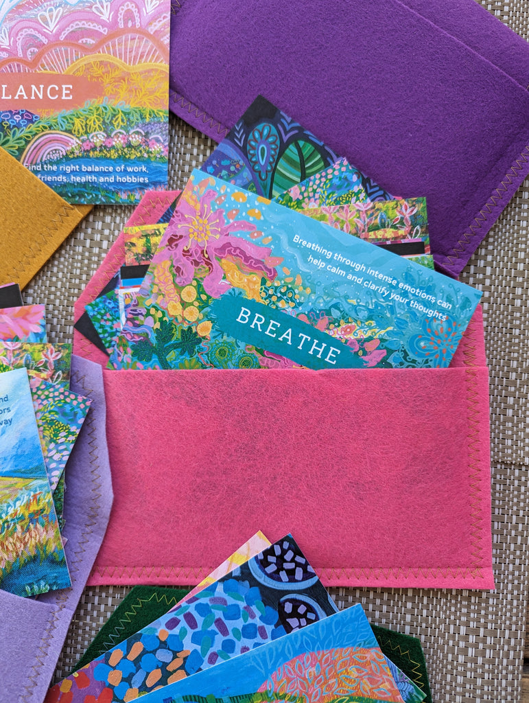 Grounded in therapies that work and designed by a counsellor and artist, these cards are practical, portable and sustainably printed in Australia. Each set comes in a felt pouch — ready to use, share, or gift.